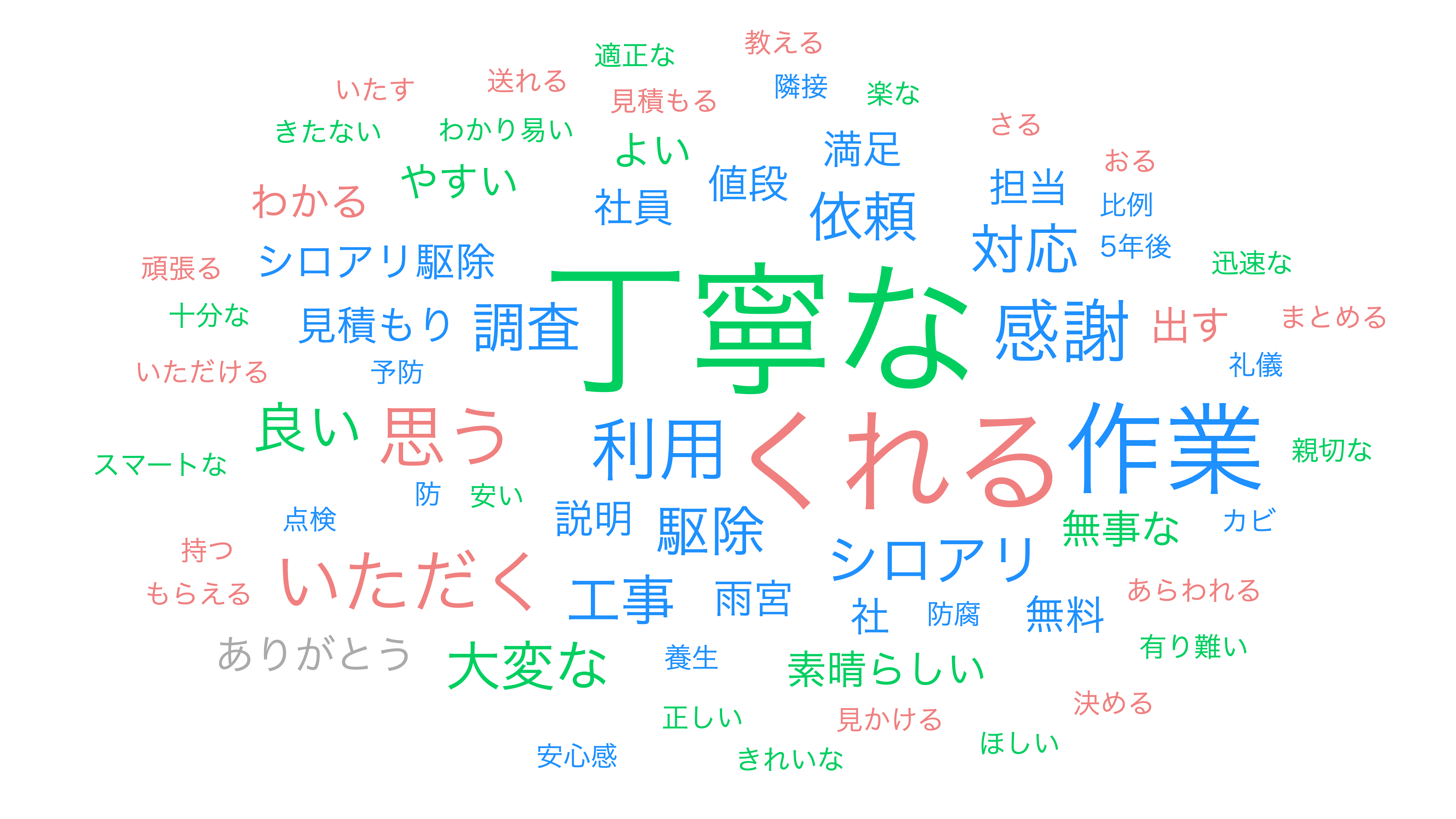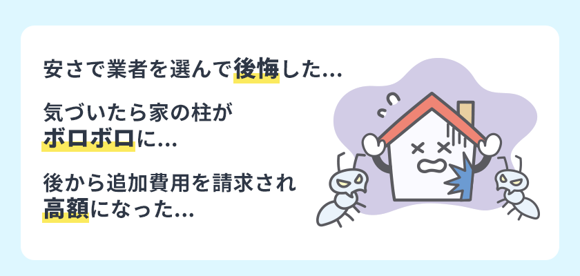 実際に料金の安さで選び「工事の内容が良くなかった」「1回で駆除しきれなかった」など、サービスを選んだ後に公開する方も多くいらっしゃいます....