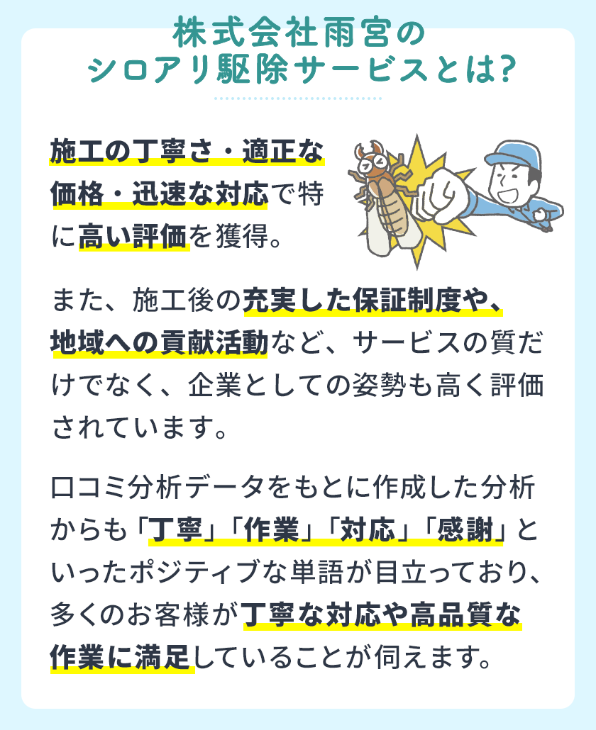 地域密着業者は、その土地特有のシロアリ被害を熟知しており 迅速な対応や地域特有の問題に適したサービス提供が可能なことが多い!