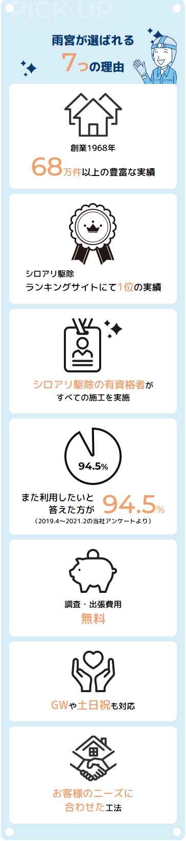 独自の工法や技術を持っている業者は、効率的かつ効果的な駆除が可能! 薬剤を使用する方法と使用しない方法の両方に対応している業者は柔軟に対応でき安心して駆除を任せることができます。